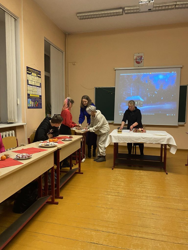 Vakarinių klasių mokiniai su mokytojais baigiantis 2023 metams prisiminė senąsias Kalėdų tradicijas, kalbėjo apie Advento prasmę. Buvo smagu minti mįsles, burtai padėjo išsiaiškinti kitų metų prognozę – vedybų perspektyvas, gyvenimo sėkmes ir nesėkmes. Jauki vakaronė pasibaigė gimnazijos aktų salėje, kur pasigrožėjome šiuo metu gimnazijoje eksponuojama prakartėle.