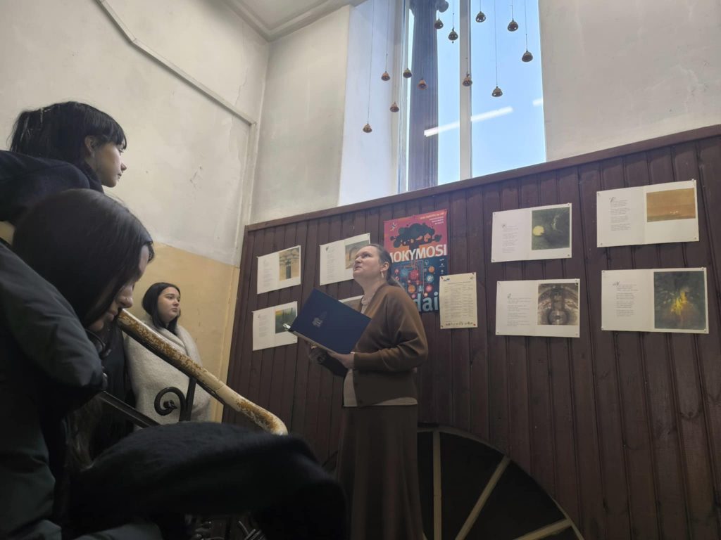 Mokytoja Vilma ne tik trumpai pristatė parodą, bet ir, priminusi šių dviejų kūrėjų likimus, pakvietė susimąstyti apie sprendimų bei pasirinkimų kainą. Dalijamės ir straipsniu, kuriame plačiau aptariami parodoje eksponuojami kūriniai – sužinokite, kuris į ciklą „Iš M. K. Čiurlionio paveikslų“ nepatekęs eilėraštis liudija S. Nėries jaunystės meilę, o kuriame poetė kalbina patį dailininką. https://www.bernardinai.lt/salomeja-neris-ir-mikalojus-konstantinas-ciurlionis-kureju-susitikimas-mene/