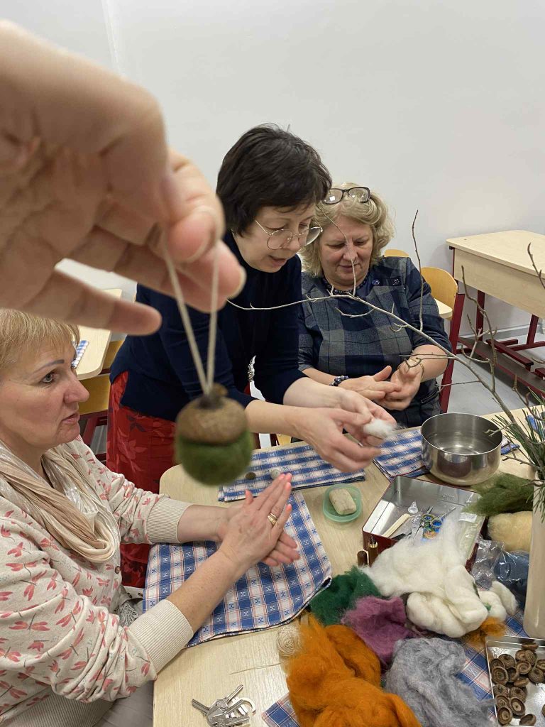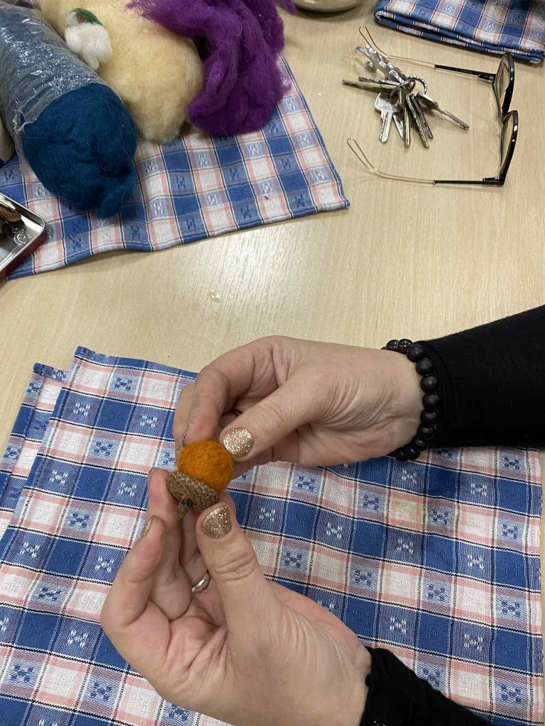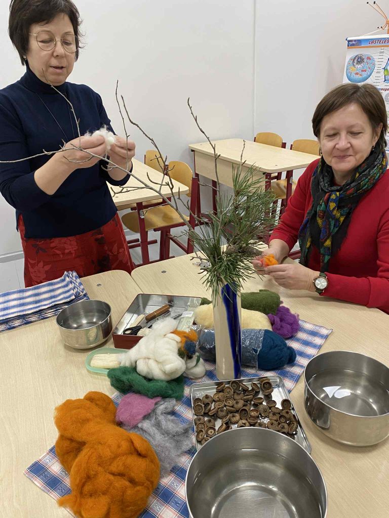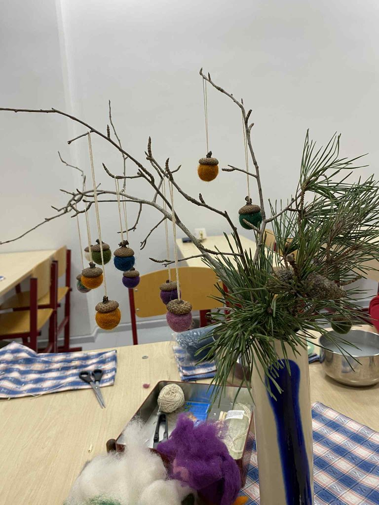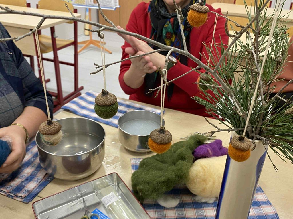 Nesuspėjusieji į adventinio vainiko kūrybines dirbtuves neliūdėjo – jų laukė jau kitas mažas stebuklas – žaisliuko iš vilnos gamyba. Anot dirbtuvių organizatorės, šis procesas ne tik malonus, bet ir naudingas, nes delnuose sukdami vilnos rutuliuką taip pat masažuojame delno viduryje esančią nedidelę daubą – ši delno vieta padeda atpalaiduoti saulės rezginį bei pilvo raumenis.